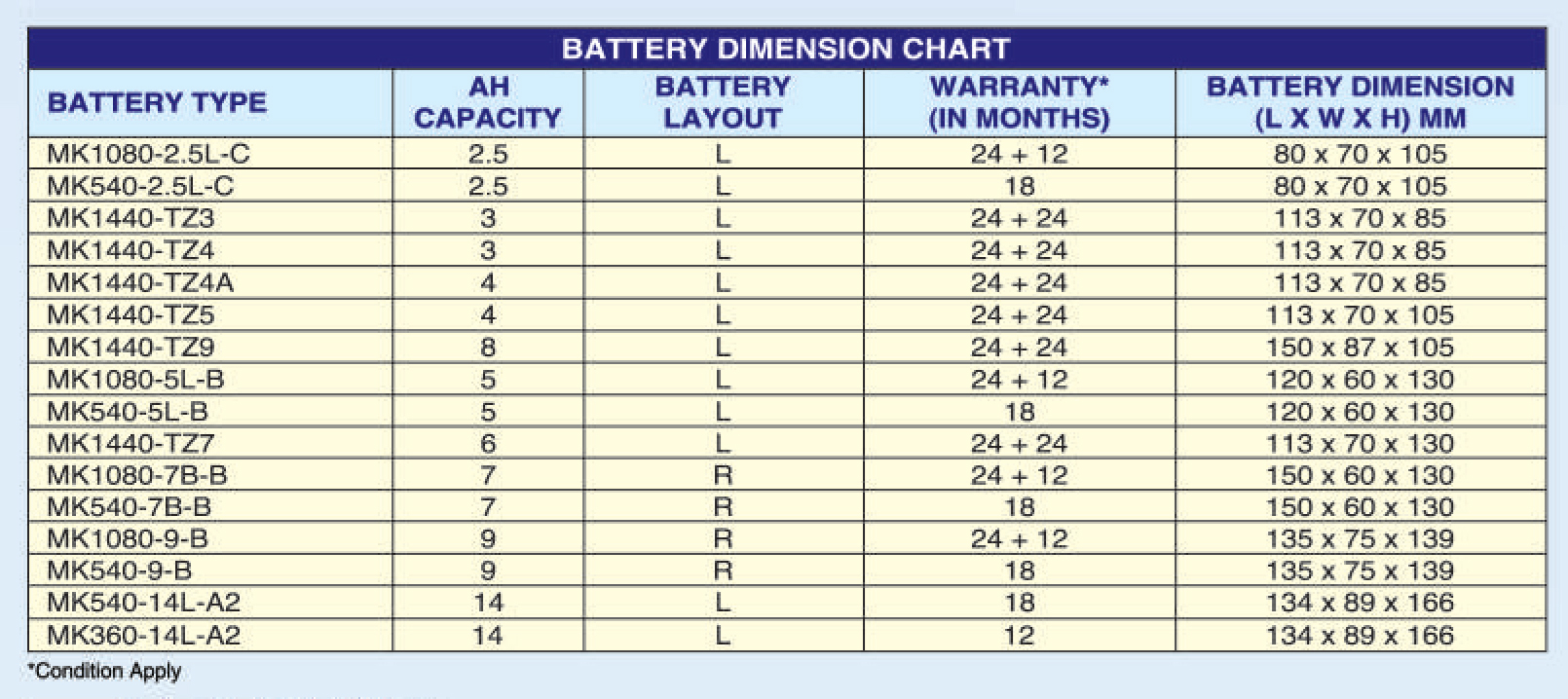 Designed to meet Japanese standards (JIS D 5302), the quality manufacturing systems of Mobiker 540 batteries are certified under ISO/TS 16949-2002 & ISO 14001-2004 awarded by RWTUV of Germany.